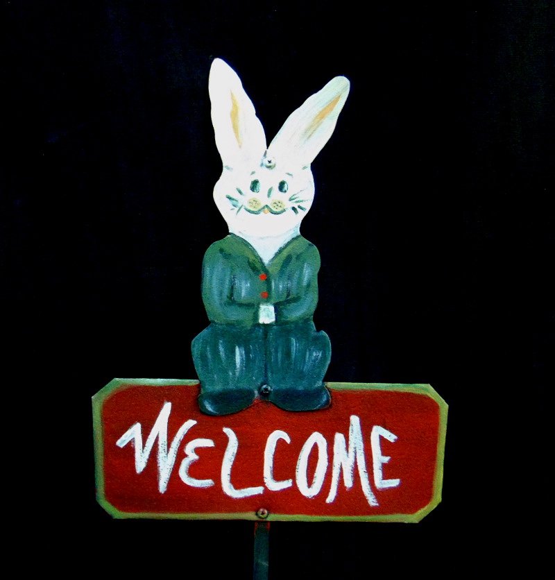 Bunny Welcome Garden Stake hand painted on recycled metal. Comes assembled and ready to display. Dimensions: 11" x 14" x 8" stake.